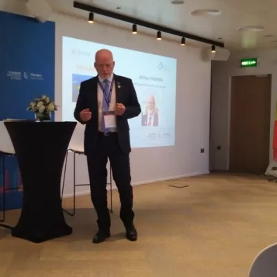 After an opening speech by Minister-President of Flanders Jan Jambon, Marijn Rabaut (Blue Cluster), Alexander D’Hooghe (ORG Permanent Modernity), Marcus Haward (University of Tasmania), Catalina Spataru (University College London), Zinzi Reimert (North Sea Farmers) and Peter Thomson (UN Special Envoy for the Ocean) elaborated on the role artificial islands can play in the blue economy.